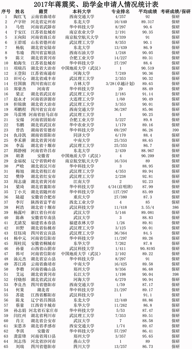 蒋震奖助学金申请人情况统计请参看下表,答辩时间安排在12月12日周二下午2:00正式开始,地点在机械大楼东楼A402室,按照表格中的人员安排依次开始,每人三分钟,请大家严格控制好时间,不用准备ppt和其他材料,没有参加面试的取消评选资格,请以下同学现场确定参评奖学金还是助学金。