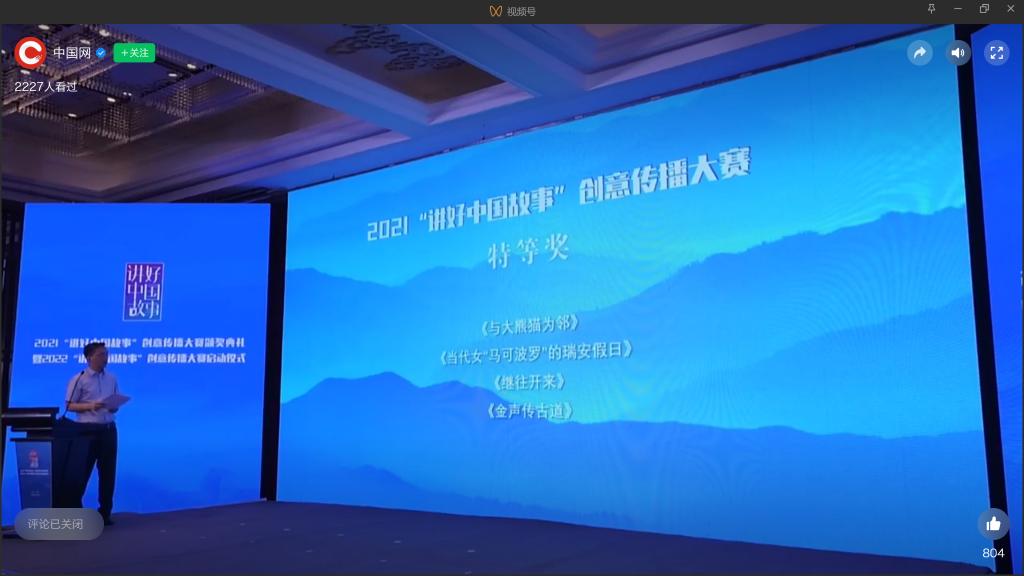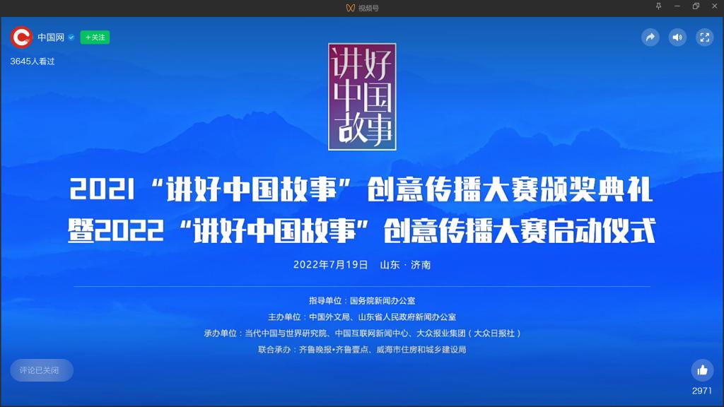 7月19日,2021“讲好中国故事”创意传播大赛颁奖典礼暨2022“讲好中国故事”创意传播大赛启动仪式在山东济南举行。公司微电影《继往开来》荣获大赛特等奖,公司协和医院作品《一封家书》获一等奖,人工智能与自动化学院作品《赛道》获二等奖。公司荣获“优秀指导单位”称号。