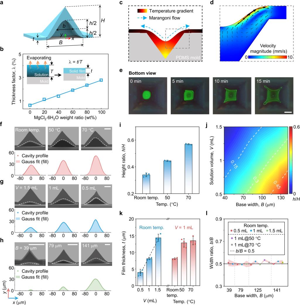 研究发现空心微结构的成形与聚合物残余溶质的分布有关,总结分析了空心微结构成形的关键因素:(1)溶液的蒸发厚度系数;(2)加热固化有利于促进蒸发驱动的流动,引发溶质向边缘运输,促进空腔的成形;(3)模板凹坑的尺寸。这三个因素实现了微金字塔结构的空心高度比从0(实心)到0.6(空心)的可控调节。给出了微金字塔内部空腔轮廓的拟合形貌方程与上述成形因素的确定关系,为空心微结构的量化设计提供了指导。