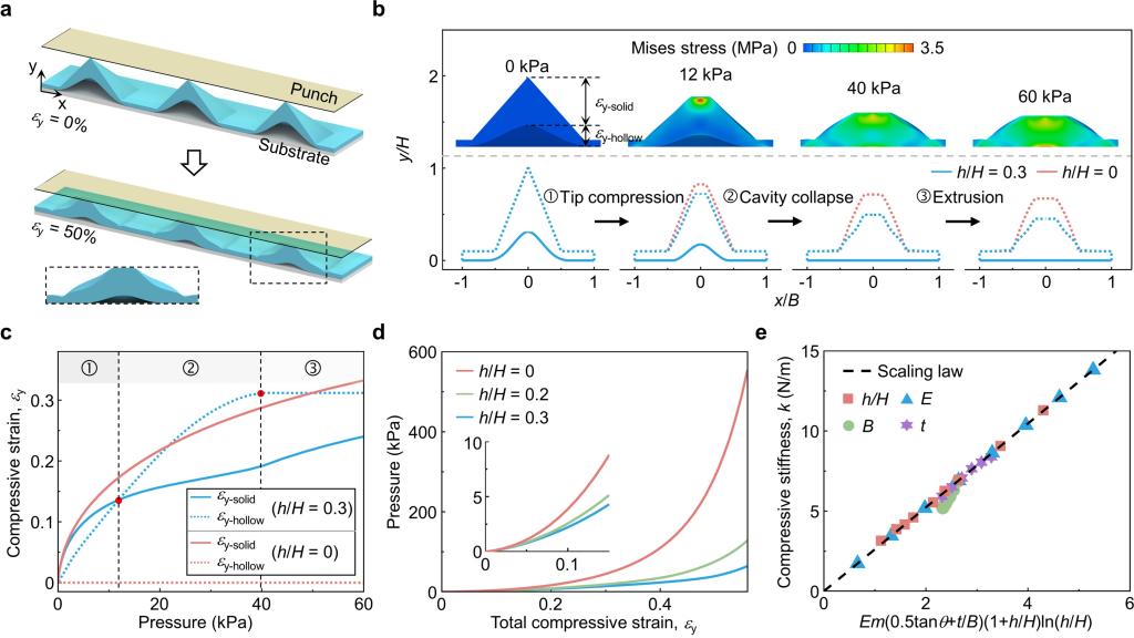 探究对比了空心、实心微金字塔结构的力学压缩性能。实心微金字塔(h/H=0)随着压力的逐步增大,其刚度急剧上升,抑制了高灵敏度的扩展。相比之下,空心微金字塔(h/H>0)内部的空腔提供了缓冲空间,在受压力时经历了尖端溃缩、空腔坍缩和自挤压三个阶段,等效压缩刚度变化更加平缓。进一步研究了空心微金字塔结构的等效压缩刚度与其结构几何和材料参数的关系,分析了空腔占比对压缩性能的影响。