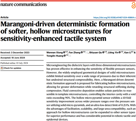 2024年7月3日,《Nature Communications》在线发表了题为“Marangoni-driven deterministic formation of softer, hollow microstructures for sensitivity-enhanced tactile system(基于马拉高尼效应的柔性空心微结构成形及触觉系统灵敏度增强应用)”的最新研究成果。黄永安教授团队提出了利用马拉高尼流驱动组装技术,制备了具有空心微结构的柔性薄膜,为三维微结构实现柔性压力传感器的高灵敏度、大量程性能开辟了新路径。
