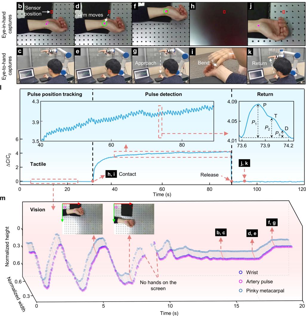 利用制备的空腔微金字塔阵列作为介电层,制备了柔性电容压力传感器。在同尺寸、材料参数下,空心金字塔相比实心金字塔微结构,灵敏度提升了近10倍,并且在较大压力时仍然保持较高的灵敏度。相较于采用各种先进、复杂的工艺来制备高深径比的针状微结构,本文采用的微金字塔虽然具有低深径比(0.7),但由于内部空腔的存在,在提高灵敏度和量程上具有明显的优势。此外,传感器在动态、静态和10 000循环载荷下,表现出了良好的稳定性、重复性和可靠性。最后,检测了柔性压力传感器在不同预载荷下对微小压力的感知能力,搭建结合视触觉的柔性压力感知系统,展示了在人体健康监测、机器触觉等方面的系统级应用场景。