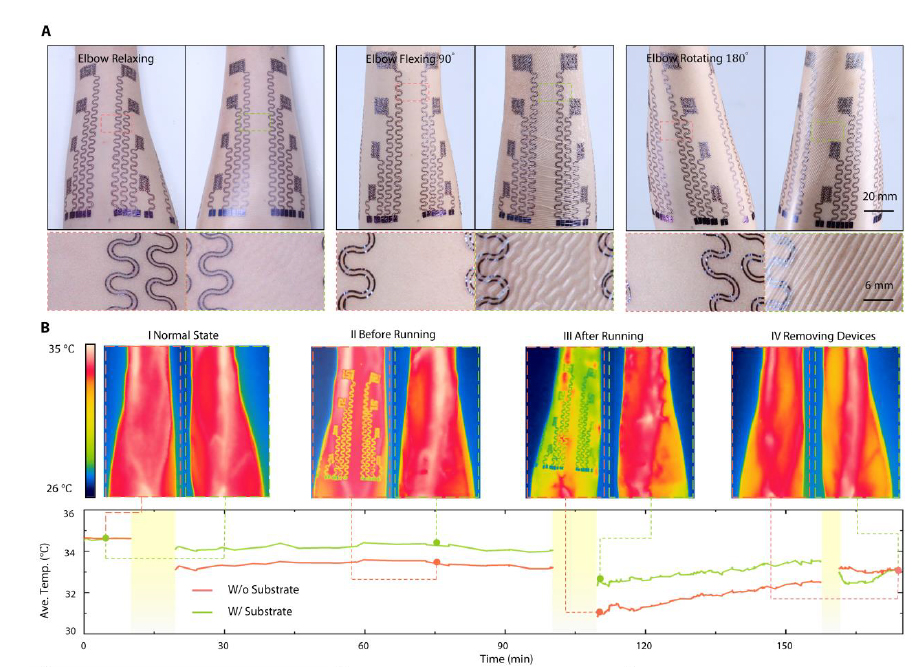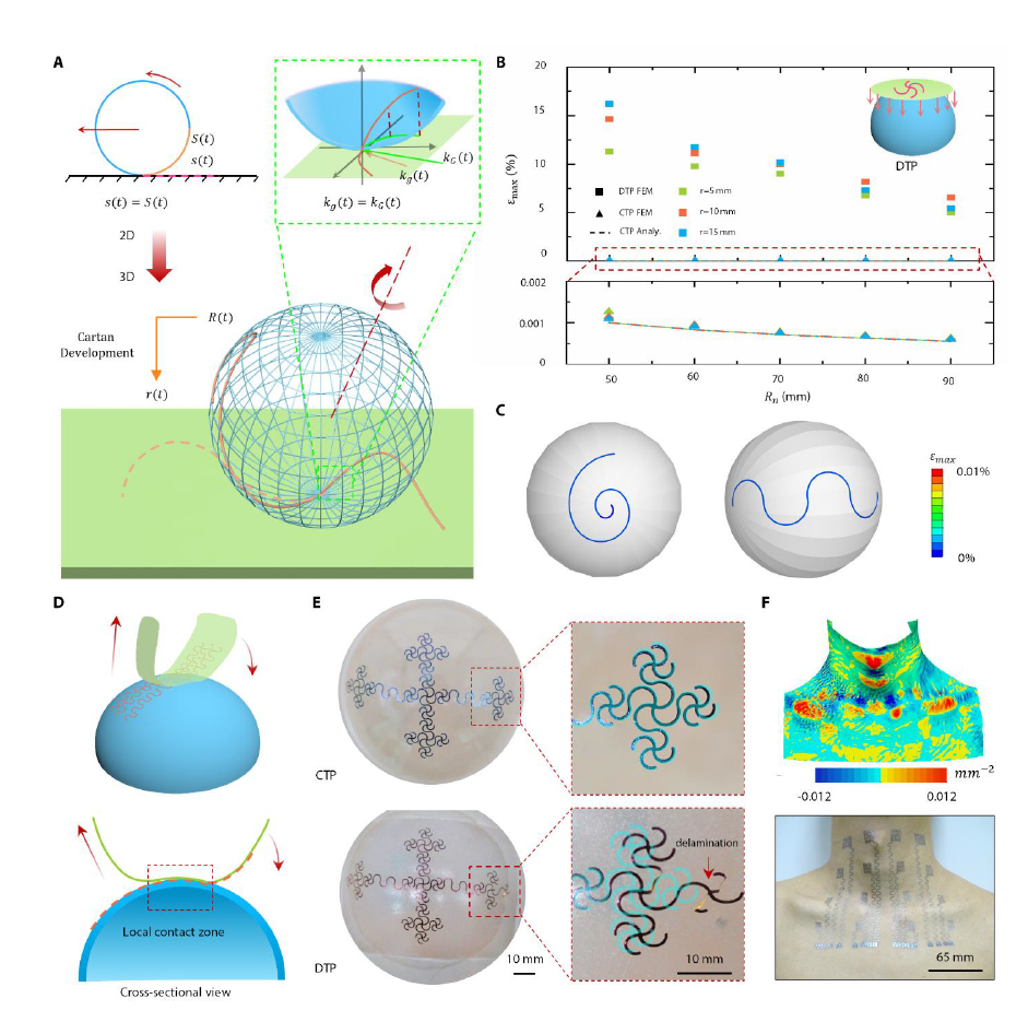 研究人员从数学领域撷取了Cartan展开的概念,把电子纹身设计成Cartan曲线,理论证明通过Cartan转印可以把镂空电子纹身转印到任意非可展曲面,同时保证了电子纹身不发生轴向拉伸和面内弯曲,理论计算和仿真均表明:通过Cartan转印得到的曲面电子器件的应变比常规转印的应变小3~4个数量级,近乎为零(图四)。Cartan转印要求电子纹身呈镂空网状,这种特性不仅仅让皮肤感受不到电子器件的力学约束,更能让体内汗液和热量顺畅地排出(图四)。此外,研究人员在低成本高效率的‘Cut-and-Paste’工艺基础上,开发了适宜大面积镂空电子纹身的整套工艺流程,避免了价格高昂的微电子工艺。