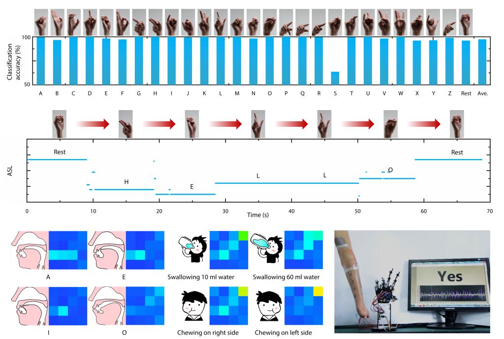 得益于突破“电路信号补偿-大面积制造-近零应变转印”等瓶颈,研究人员展示了大面积电子纹身在未来数字健康、高精度人机交互等领域的成功应用(图五)。英文字母手语识别、单词字母连续识别和实时假肢控制等技术为残障人士进行高性能人机自然交互提供可能;颈部肌电云图采集有助于语音康复、吞咽功能评估、颈椎病监测等;多通道的心电监测可以反映心脏不同部位的状况,实现心律不整、心悸等多种心脏疾病的监测。