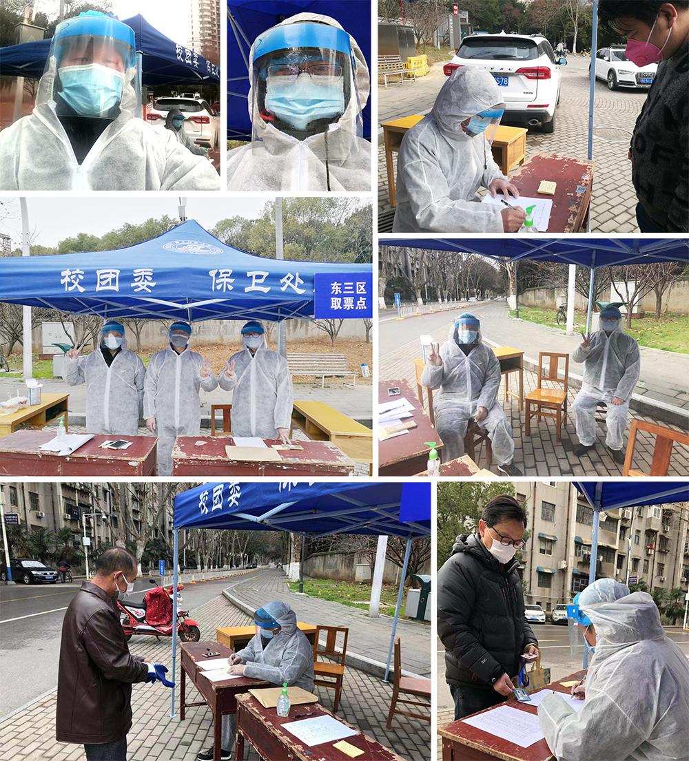 2月13日,由公司工业及制造系统工程系教师黄金国、仪器科学与技术系教师孙燕华、流体动力控制工程系教师朱碧海、办公室主任朱文凯组成的党员突击队负责在喻园超市门口分发出入社区票券,做好领票登记册,分发校内人员订餐。他们一天分为两班,每班两位队员执勤。值班时间从上午8:30到13:15,下午从13:15到18:15。由上午班队员于8:30前往八号楼开会,参加相关培训,并领取工作资料和防护用品等,随后到喻园超市门口执勤。下午班队员提前10分钟去交接,由上午班队员告知要求,并转交相关材料与物资。