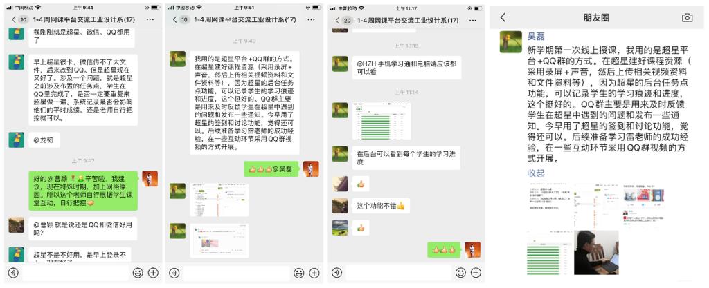 图8 工业及制造系统工程系教师肖蜜网络教学及QQ群内员工反馈截屏