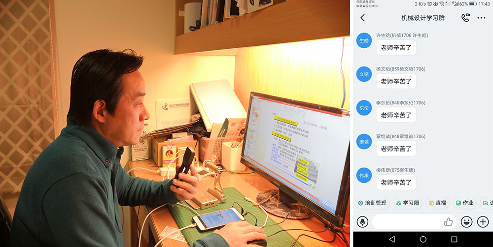 机械设计教学团队迅速于2月5日开通了《机械设计》MOOC,多次举行视频会议,分享教学资源与素材、在线教学经验,研究开课事宜。《机械设计》是机械大类核心基础课,授课对象为全校机械大类五个学院10余个专业的大三员工,约1000人/年。课程组教师陈继勇春节前到台湾探亲,没带电脑,为了让直播课堂取得更好的教学效果,他在2月6日就率先组建了班级员工QQ群,并组织员工测试了多种直播平台,最后选定采用中国大学MOOC+钉钉直播平台。