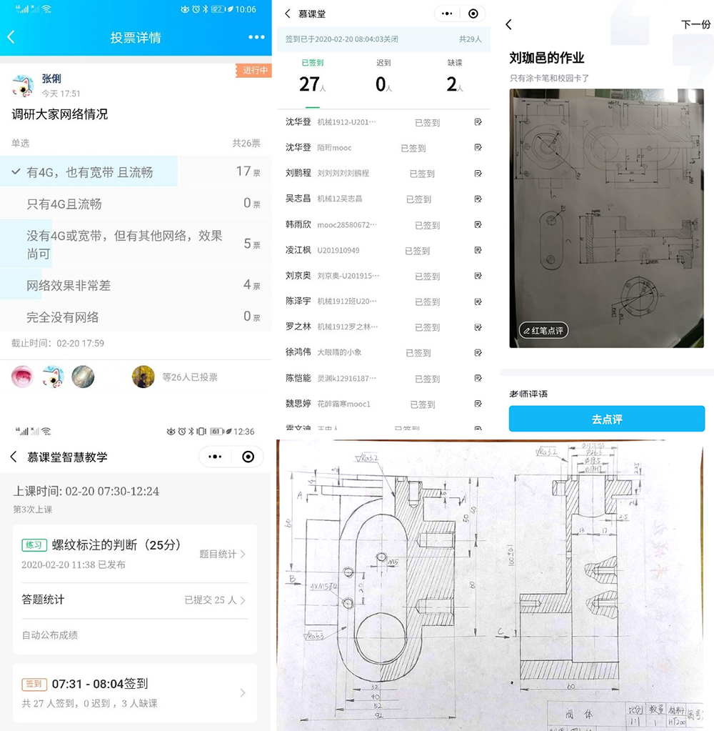 张俐老师在2月10日通过班级员工QQ群和中国大学MOOC平台多次发布新学期教学公告,提前组织课程组教师和员工测试了多种直播平台,最后选定采用中国大学MOOC发布网络教学视频和课件,并通过慕课堂进行签到、点名、讨论和课堂练习互动,同时通过QQ视频直播平台发布三维模型、讲解重难点和答疑,QQ作业平台进行作业的发布和批改回复。