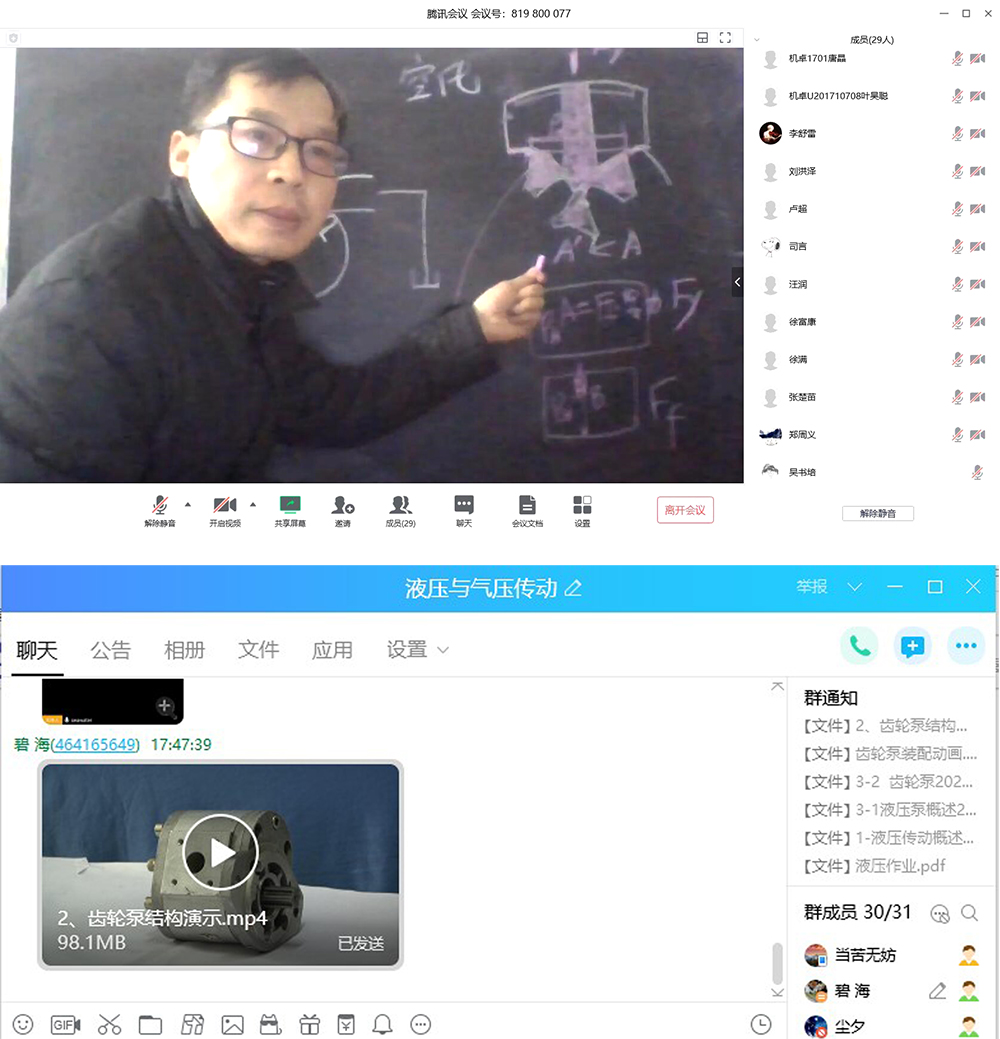 对于17级卓越工程班30人的小班课堂而言,还是要坚持“直播”以加强视频互动、提高真实感。结合教师自备的“板书”随时讲解员工们的疑问;并对一些原本“尖深”教学内容或作适当删减或后移至正常教学恢复后;减轻员工学习负担,作业量也适当减轻;更多利用以往仅提供给员工自学使用的液压元件“真人真物”视频教学短片。