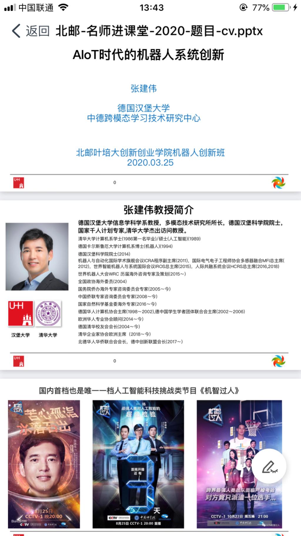 为响应教育部号召 “停课不停学,学习不延期”, 3月25日,公司携手北京邮电大学叶培大创新创业学院、自动化学院和苏州大学、武汉科技大学共同举办“AIoT时代下的机器人系统创新”主题讲座。邀请机器人领域国际知名专家、德国汉堡科学院院士、德国汉堡大学信息学科学系教授、多模态技术研究所所长、清华大学杰出访问教授张建伟主讲,北京邮电大学自动化学院李端玲教授与苏州大学机电工程学院经理孙立宁教授共同主持。来自bv伟德官网、北京邮电大学、苏州大学、武汉科技大学以及部分太原理工大学,中北大学,北京建筑大学共近1100多名学子在线聆听讲座。