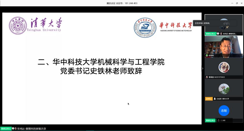 4月19日,“清华—华科机械联合博士生学术交流专场论坛”及闭幕式在线上圆满完成。本次联合论坛共有来自清华大学和bv伟德官网的八位优秀的学子作口头报告,并邀请了清华大学机械工程系张晨辉教授与大家分享自己的科研经历与成果。bv伟德官网公司党委书记史铁林、清华大学机械工程系党委书记吕志刚、清华大学机械工程系系主任汪家道及来自两所高校的数百名员工通过腾讯会议参加论坛。