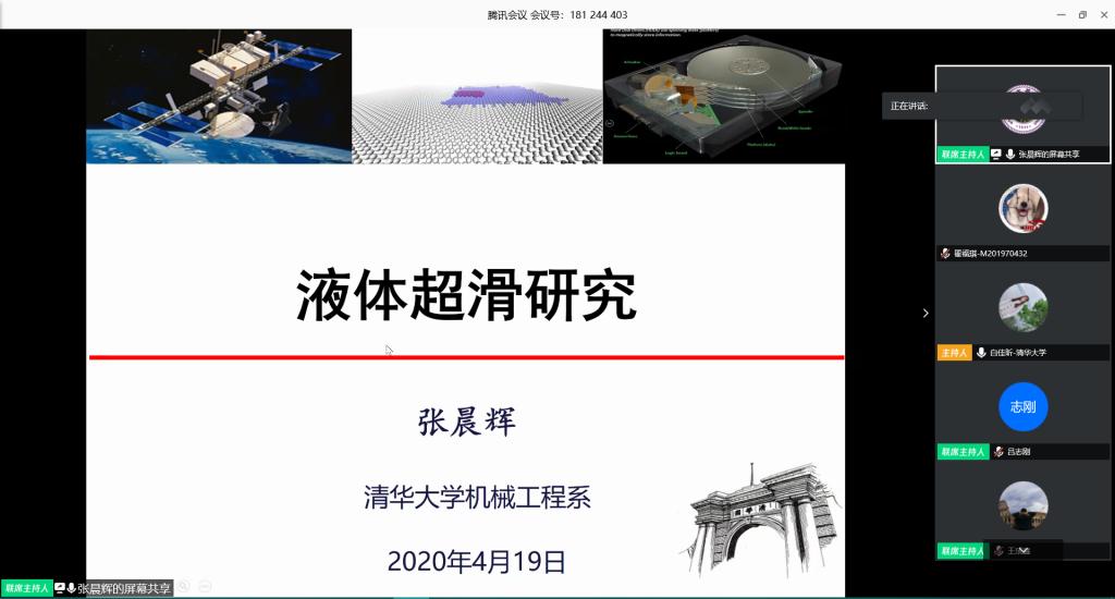4月19日下午,张晨辉做了题为 “液体超滑研究”的特邀报告,从“一杯酸奶引发的故事”引入了他所在研究团队在液体超滑领域的研究,并介绍了在研究期间克服了种种困难,最后找到突破取得成绩的过程。随后,他通过语音和聊天室与同学们交流,使大家既拓展了研究视野又领悟了研究精神。