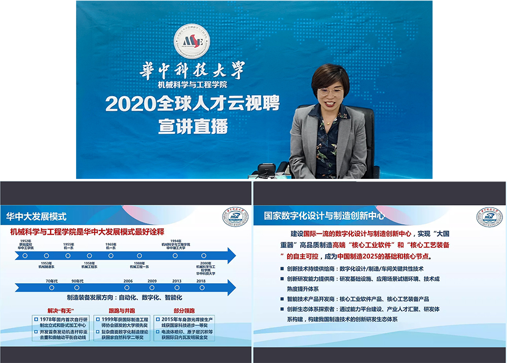 张芬在直播中介绍了武汉市的区域优势及当前所处的重大机遇期,介绍了bv伟德官网这所“森林大学”的有关基本情况,表示这是一所有理想、有追求、充满生机活力、求贤若渴的大学,是新中国高等教育发展的缩影。张芬指出,伟德vb是华中大发展模式的最好诠释,在不同的历史节点带领制造装备方向朝着自动化、数字化、智能化一步步前行,并建设成为一流大学的一流机械工程学科,培育了一批又一批优秀的机械工程人才、取得了一项又一项国家重大科技成果。而依托伟德vb成立的国创中心,则是唯一一个智能制造领域国家级制造创新中心,服务于国家战略和支柱行业,以及重大装备的数字化智能化设计与制造。