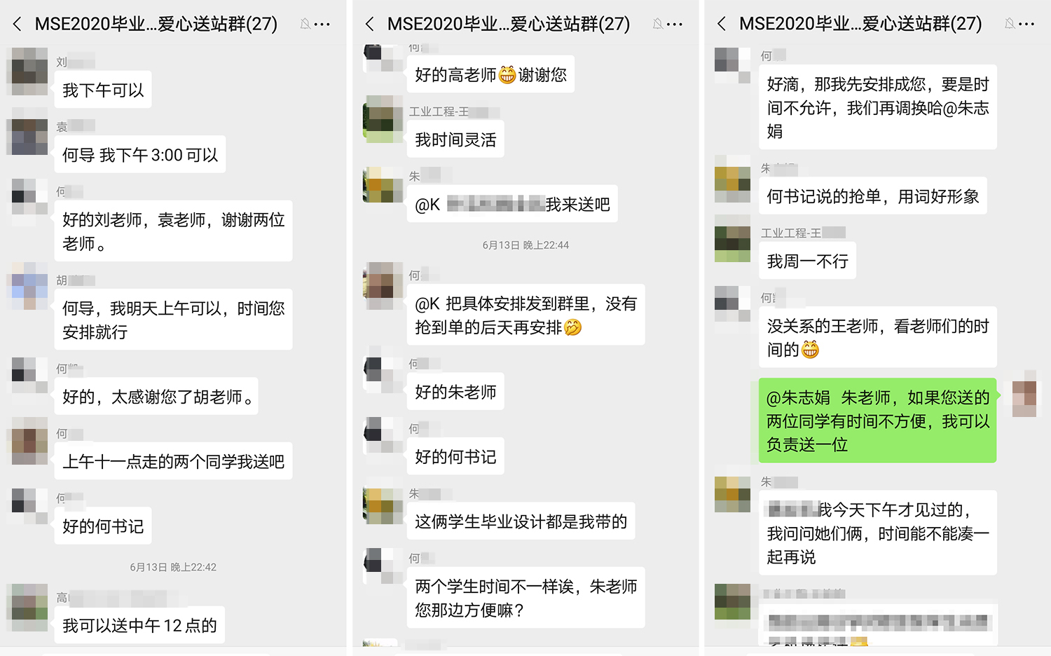 在倡议发出的短短几小时内,已经有近30名教职工积极加入到“暖心送站车队”。13日晚,当学工组刚刚整理出第一批需要送站的毕业生信息发布在微信群里,立即就有教职工响应,不到十分钟,“任务”就都被领取完毕,这 “抢单”的场面让稍晚看到信息的教职工们连连感叹,下次一定要拼手速了!14日晚,“订单”比第一批多出不止一倍,但依然“秒光”,有教职工已经是第二次“接单”了。