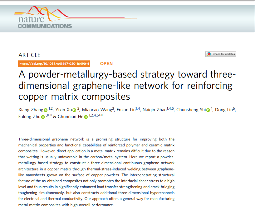 6月2日,《自然·通讯》(Nature Communications)发表了公司朱福龙教授团队与天津大学何春年教授团队关于石墨烯-金属复合材料的最新合作研究成果“A powder-metallurgy-based strategy toward three-dimensional graphene-like network for reinforcing copper matrix composites(一种三维类石墨烯网络增强铜基复合材料的粉末冶金制备策略)”。天津大学张翔博士为论文第一作者,bv伟德官网硕士生徐伊昕、博士生王淼操为论文第二、三作者,朱福龙教授、何春年教授为论文的通讯作者,并带领各自团队分别完成本文的理论模型设计与计算部分与实验部分。堪萨斯州立大学林栋教授也对此文给出了充足的建议。