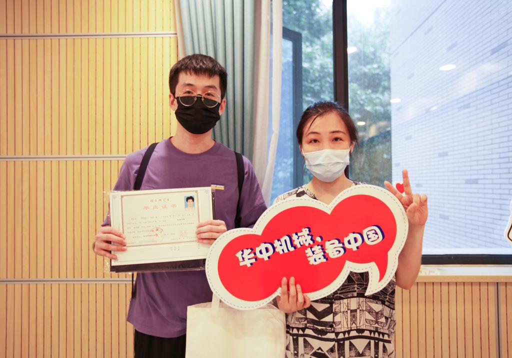 (图为6月29日第一位领到学位证、毕业证的研究生毕业生与研究生辅导员曾峥合影留念)