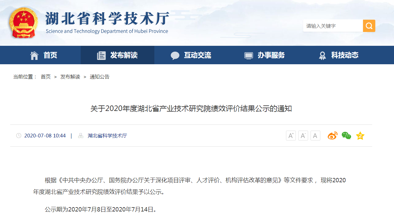 此次由湖北省科技厅组织的绩效评价考核,采用各研究院提交自评报告,专家函评的方式评审,重点评价研究院上一年度建设及运行服务情况,包括人才队伍、研发条件、研究成果、服务我省经济社会发展及科技成果转化等情况。