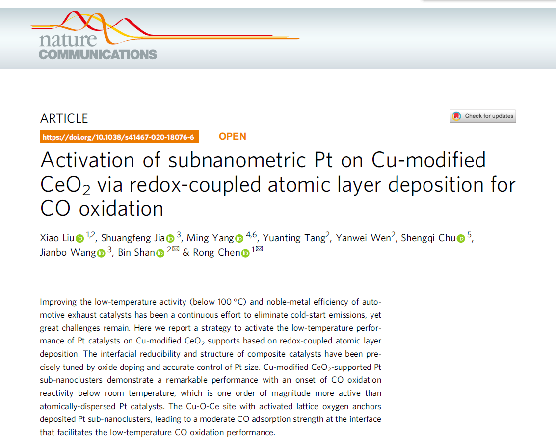 8月25日,《自然·通讯》(Nature Communications)在线刊发了公司陈蓉教授团队关于贵金属/氧化物界面精细制造的最新研究成果“Activation of subnanometric Pt on Cu-modified CeO2 via redox-coupled atomic layer deposition for CO oxidation(氧化铈负载的Pt亚纳米团簇界面精细调控活化低温催化反应)”。伟德vb为论文第一单位。公司青年教师刘潇博士为论文第一作者,陈蓉教授为通讯作者,材料学院单斌教授为共同通讯作者。