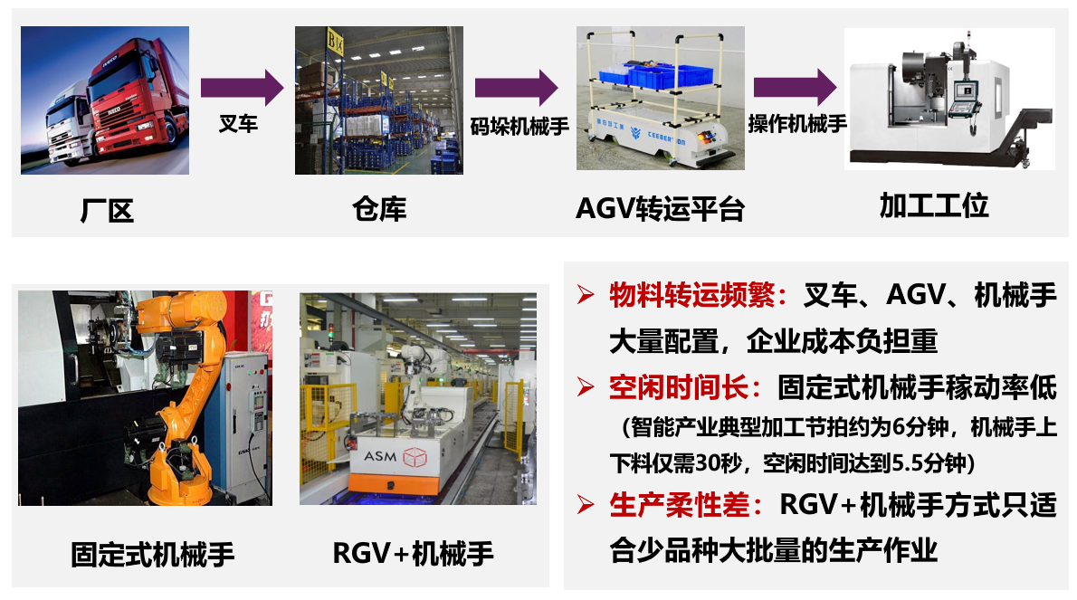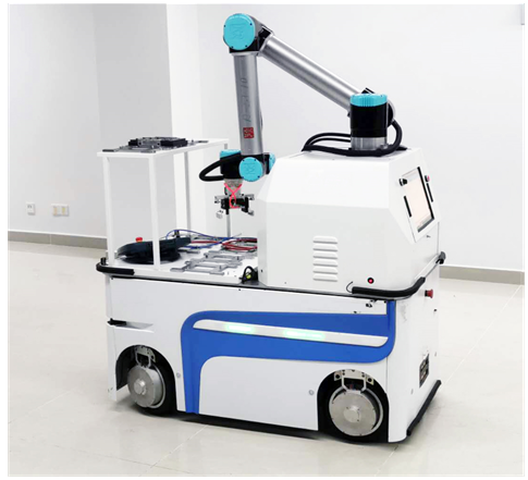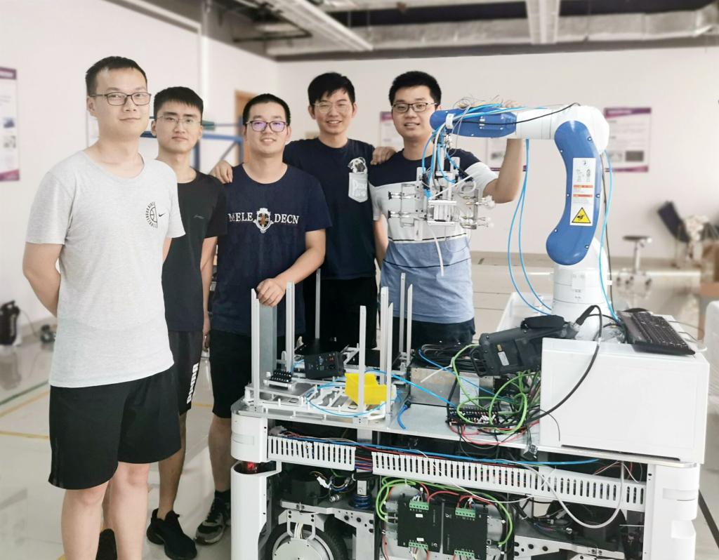 吴天豪团队提出的“基于人工智能的无轨自主移动复合型AGV”项目以冗余驱动下多系统耦合建模、高冗余自由度下一体化运动规划、力矩分配车臂协调控制、多机自律任务分配的协同调度为研究对象,研制出了高速高精无轨自主移动复合型AGV,集叉车、AGV和工业机械臂功能于一体,具有作业灵活性高、部署时间短、承载能力强、转运环节少的优势,能够降低生产成本,提高生产效率与制造柔性,大幅提升智能制造自动化水平。在智能制造、无人车间领域有广阔的应用前景。传统的智能制造产业物料转运工序多,过程繁琐,企业成本负担重,固定式的机械手空闲时间长,稼动率低,而RGV+机械手的组合只适合少品种大批量生产作业,传统作业模式无法满足智能制造产业高效率和强柔性需求。