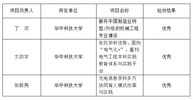获得结题优秀的3个项目分别是:中国科学院院士丁汉牵头完成的“服务中国制造业转型/升级的机械工程专业建设”;国家级领军人才文劲宇牵头完成的“依托学科优势,面向‘电气化+’,重构电气工程本科实践教育体系与实践平台”;国家级领军人才张新亮牵头完成的“光电信息学科多方协同育人模式改革与实践”。