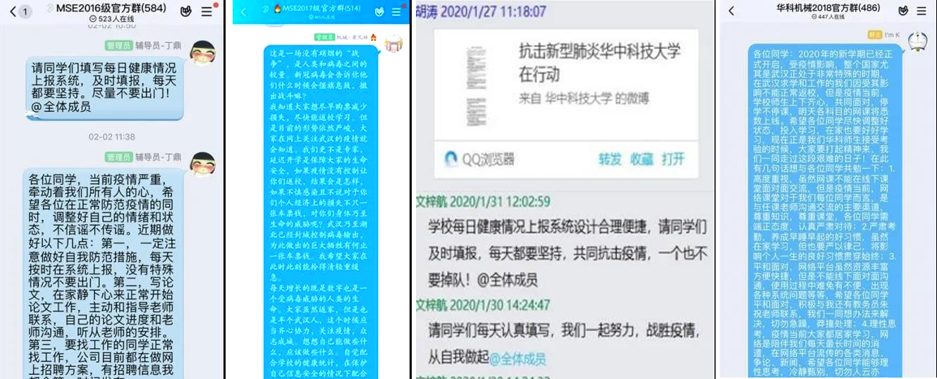 放假以来,各年级辅导员在年级群、微信朋友圈、QQ空间等多种渠道与员工保持联系,做到了线上的7天、24小时在线。各年级辅导员通过年级QQ 群发布疫情防控措施,转发官方公众号相关文章,及时为员工及家长解读疫情影响下的学校应对措施,让员工正确对待疫情,不信谣不传谣。通过电话,QQ,微信等形式传递正能量,疏导员工心理问题。点对点联系受情绪困扰的员工,积极开展情绪缓解工作,通过对话开导、转发各类实用公众号文章、推荐电影书籍、记日记等多种方式,帮助员工在疫情期间稳定情绪。