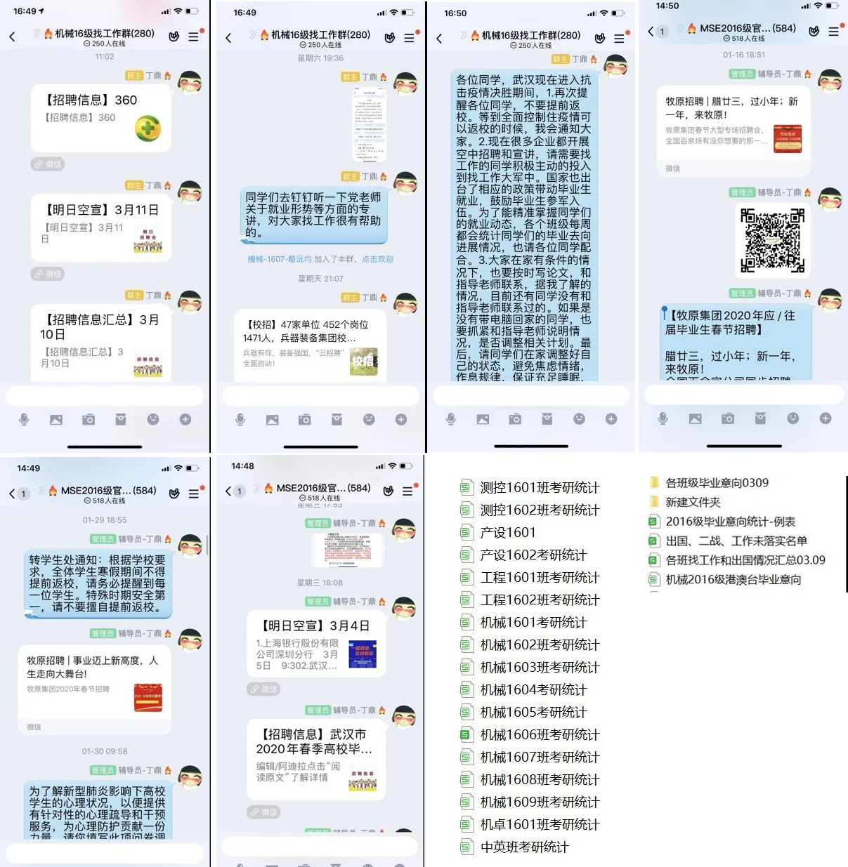 2016级辅导员建立多重就业发布平台,通过年级群和就业群以及邮件等形式每日向员工发布就业信息,同时及时了解招聘公司招聘需求。主动出击,动员员工积极帮忙提供就业信息,2020年以来已发布就业信息百余条,建立毕业生就业去向台账,每周更新员工签约情况,掌握员工签约动态。