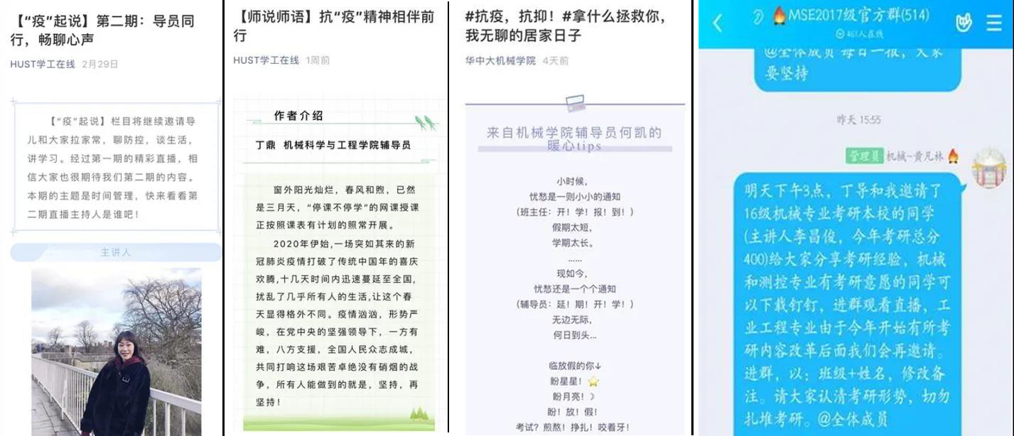 各年级辅导员积极开展学风教育引导工作,充分利用网络平台,为员工提供学业指导和心理疏导。辅导员丁鼎通过讲授在线课堂“时间管理与战‘拖’”,帮助员工掌握如何管理时间、如何战胜拖延症;同时在学工处微信公众号发布文章“抗‘疫’精神相伴前行”,和员工一起践行勇于担当、永不言弃、学无止境的精神。辅导员何凯在学院微信公众号发布文章“抗疫,抗抑!拿什么拯救你,我无聊的居家日子”,引导员工正确看待疫情,不焦虑,丰富日常生活。辅导员丁鼎和黄凡林策划考研经验分享线上直播,将于近日进行。辅导员胡涛和文梓航联合新生教师班主任力量,在线召开主题班会,强化学风教育引导工作。