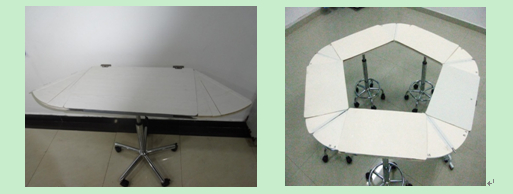1. 可以拉出两侧扇板,并通过卡槽机构固定实现拼接桌面,既能够实现多张桌子拼接成正多边形讨论桌,适应不同人数的小组讨论的需求;又能够实现拼接成大的椭圆形会议桌,满足大型会议、室内晚会的需求,使教员工活更加丰富多彩。