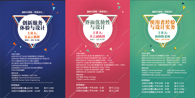 10月31日至11月3日,由台湾大同大学设计学院杨朝阳博士主持的主题为“使用者经验与设计实务”的课程在东十二楼和东九楼开讲。