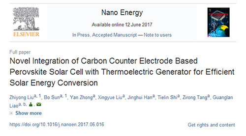 ,纳米领域权威期刊《Nano Energy》在线刊发了公司数字制造装备与技术国家重点实验室史铁林、廖广兰、汤自荣教授研究团队关于钙钛矿太阳能电池与热电模块集成的研究论文“Novel Integration of Carbon Counter Electrode Based Perovskite Solar Cell with Thermoelectric Generator for Efficient Solar Energy Conversion”。博士生刘智勇及博士后孙博为论文共同第一作者,廖广兰教授为通讯作者。