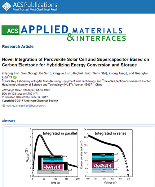 当月14日,材料领域权威期刊《ACS Applied Materials & Interfaces》在线刊发了公司数字制造装备与技术国家重点实验室史铁林、廖广兰、汤自荣教授研究团队关于钙钛矿太阳能电池与超级电容器集成的研究论文“Novel Integration of Perovskite Solar Cell and Supercapacitor based on Carbon Electrode for Hybridizing Energy Conversion and Storage”。博士生刘智勇、仲艳为论文共同第一作者,廖广兰教授为通讯作者。