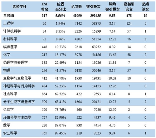 公司15个学科领域保持在ESI全球前1%,并列一流大学建设高校第9位,其中工程学、材料科学、计算机科学保持在全球前1‰,并列一流大学建设高校第7位。