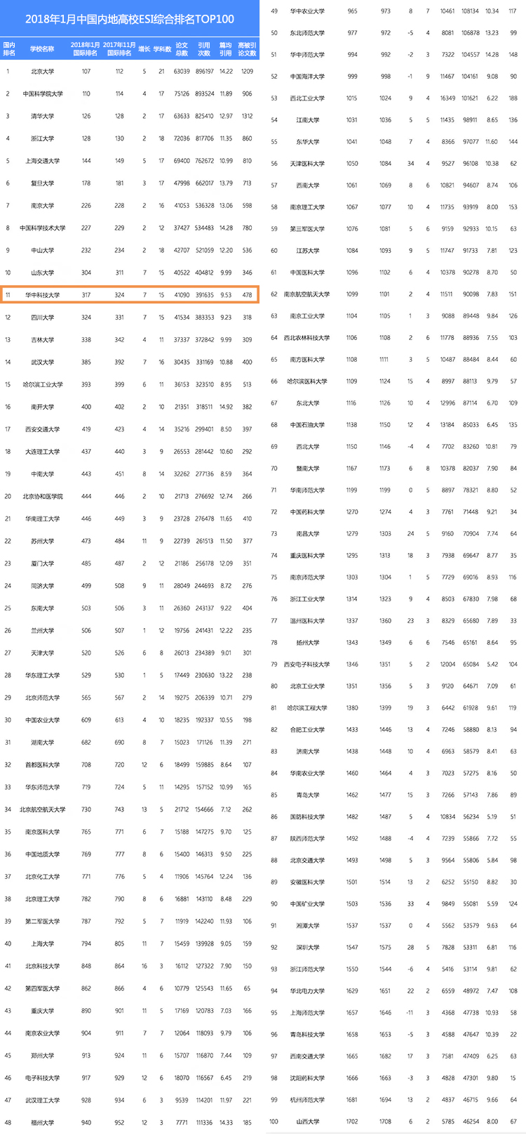 一流大学和一流学科如何评价,ESI是个极其重要的参考依据。目前全球很多知名高校都在采用ESI来衡量和评价学科实力,国内各级教育主管部门和大学最近几年来也开始越来越重视ESI指标,越来越多的大学把进入ESI全球前1%的学科数量定为发展目标之一。ESI数据库每两个月更新一次,本次数据的更新时间为美国时间2018年1月11日(北京时间1月12日),覆盖时间段为1月1日至2017年10月31日。