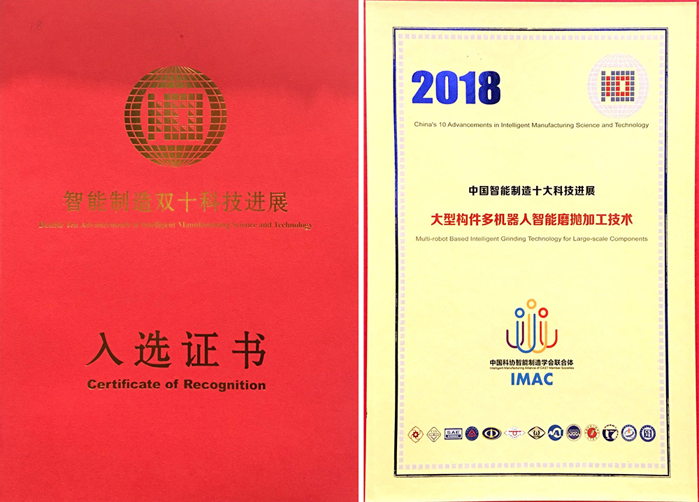 “大型构件多机器人智能磨抛加工技术”经过十余年复杂曲面数字化制造理论积累和实践验证,攻克了三维匹配与视觉定位、离线编程、型面误差检测、在线检测软件、磨抛工艺优化等多项关键技术,研制出国内首套大型构件机器人磨抛系统,实现了大型构件的高精高效智能化加工。依托该项核心技术,丁汉院士团队与中车株洲所深度合作,联合成立无锡中车时代智能装备有限公司,聚焦电力能源、轨道交通、航天航空、船舶等重点领域,提供大型关键零部件整体智能加工解决方案,其主要产品“大型风电叶片机器人打磨系统”被认定为江苏省重点推广应用的新技术新产品与江苏省首台(套)重大装备产品。