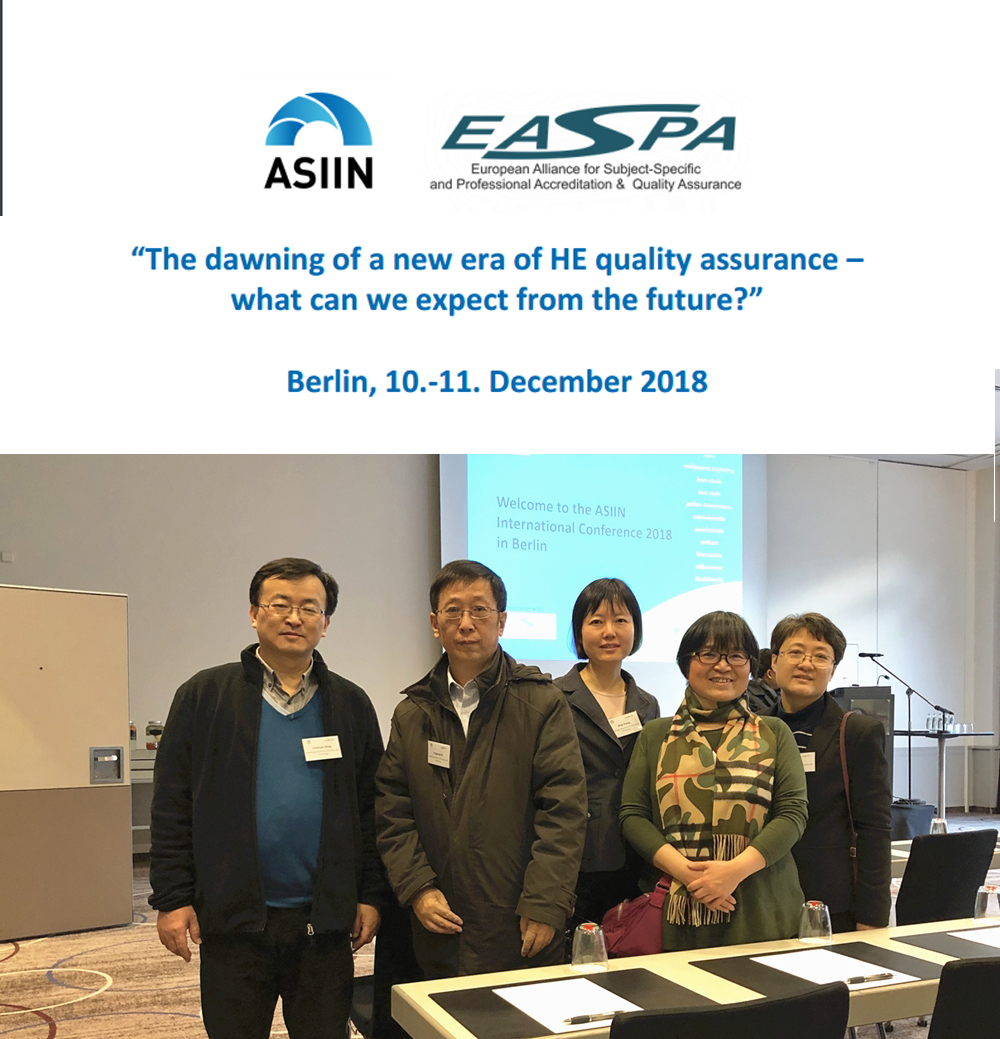 ASIIN(German Accreditation Agency for Study Programs in Engineering, Informatics, Natural Sciences and Mathematics,http://www.asiin.de)是德国权威的工程、信息科学、自然科学和数学专业认证机构,是欧洲工程教育项目学位认证体系(European Accredited Engineering Project, EUR-ACE)的创立者及成员。本次国际会议主题是“新时代高等教育质量保证”,会议内容涉及:世界高等教育的最新发展、高等教育的互认、如何评价内部和外部的认证、认证和员工培养质量。