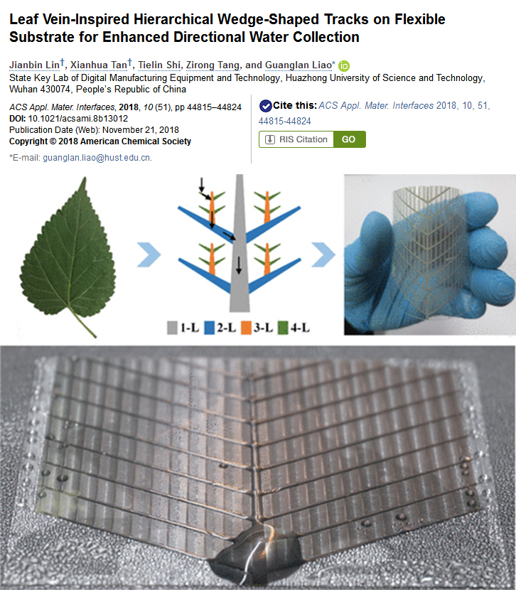 近日,期刊《ACS Applied Materials & Interfaces》以封面文章形式刊发了公司数字制造装备与技术国家重点实验室史铁林、廖广兰、汤自荣教授研究团队关于仿生水汽冷凝收集微纳结构的研究论文“Leaf Vein-Inspired Hierarchical Wedge-Shaped Tracks on Flexible Substrate for Enhanced Directional Water Collection(柔性基底上受叶脉启发的分层楔形流道用于加强方向性水收集)”,公司2016级博士生林建斌与博士后谭先华为论文的共同第一作者,廖广兰教授为通讯作者。