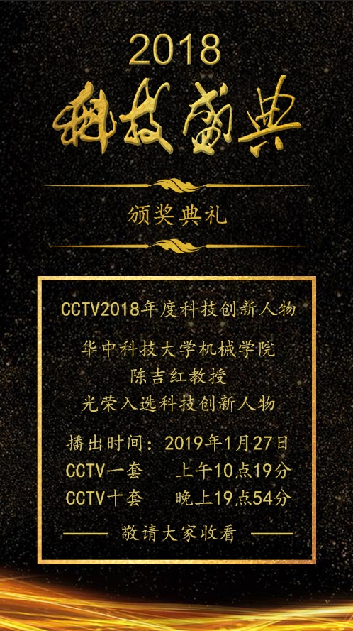 1月27日,科技盛典——“2018年度科技创新人物颁奖典礼”在央视揭晓,伟德vb陈吉红教授荣获2018年度科技创新人物,是教育部推荐的唯一一位获奖代表。中国科学院经理、党组书记白春礼,中国工程院经理、党组书记李晓红以及科学技术部、教育部、中国科学技术协会、国家自然科学基金委员会、国家国防科技工业局等领导参加颁奖典礼。同时获得此项荣誉的还包括港珠澳大桥岛隧工程总工程师林鸣,中国南方电网专家委员会主任李立浧等共10位个人和北斗卫星研究团队、蛟龙号研究团队等3个团队。
