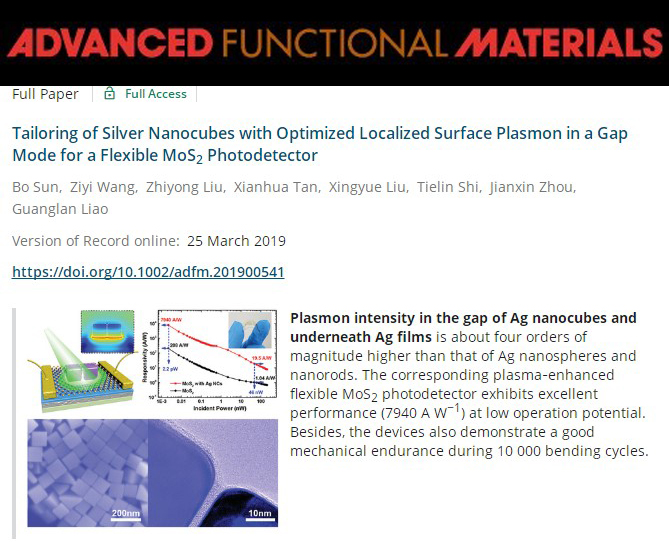 3月25日,《Advanced Functional Materials》(影响因子:13.325)在线刊发了公司史铁林教授、廖广兰教授领导的微纳制造研究团队关于原子级厚度MoS2薄膜柔性光探测器的最新成果:“Tailoring of silver nanocubes with optimized localized surface plasmon in a gap mode for flexible MoS2 photodetector (定制在间隙模式中具备最佳局域表面等离子体的银纳米方体及其在柔性MoS2光探测器中的应用)”。我院博士后孙博为该论文第一作者,廖广兰教授为通讯作者。