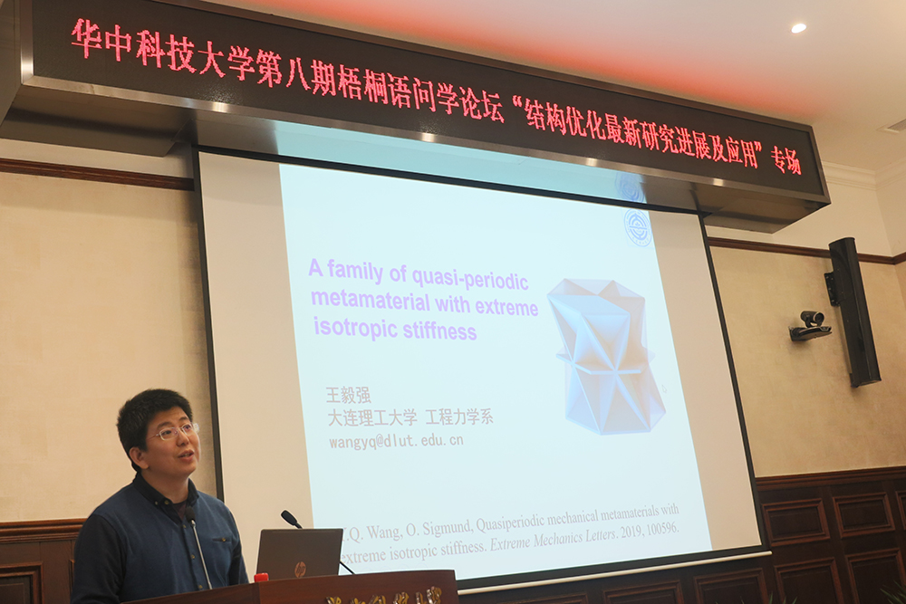 王毅强作了题为“A family of quasi-periodic metamaterial with extreme isotropic stiffness(一类具有各向同性极限刚度的准周期超材料)”的报告