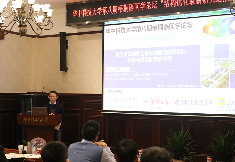 孟亮作了题为“基于仿生的多边形双曲面点阵超材料设计与多功能性能分析”的报告