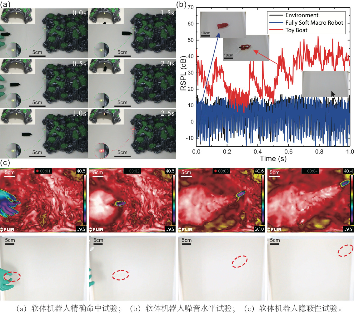 本文首次将马兰戈尼推进的原理应用于软体机器人驱动,展示了一种能够灵活运动在液体界面上的无线全软体机器人。该软体机器人由全软材料构成,不含任何机械传动部件,因此噪音水平较低,而且驱动过程无明显热效应,不存在热疲劳和机械磨损的问题。另外由于驱动力来源于液体环境的能量梯度,该软体机器人只需携带一定的驱动材料即可,不存在能量源和机器人本体软材料之间的集成问题。设计者可以将重心放在如何实现应用场景所需的功能,无需考虑驱动的问题,以充分发挥软体机器人的潜力。在文章中,研究者就展示了该软体机器人的“精确命中目标”和“隐蔽”能力。
