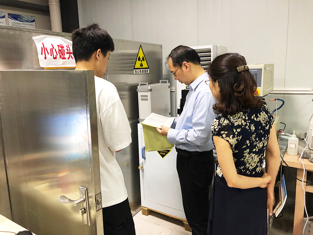 在东八楼后厂房实验区,重点检查了辐射安全和机械加工安全。在超精密与智能制造实验室,检查小组重点查看了放射源的使用记录情况,并检查了辐射剂量的检测设备、防护设施。对实验室内乱拉乱接电线的情况提出了整改要求。