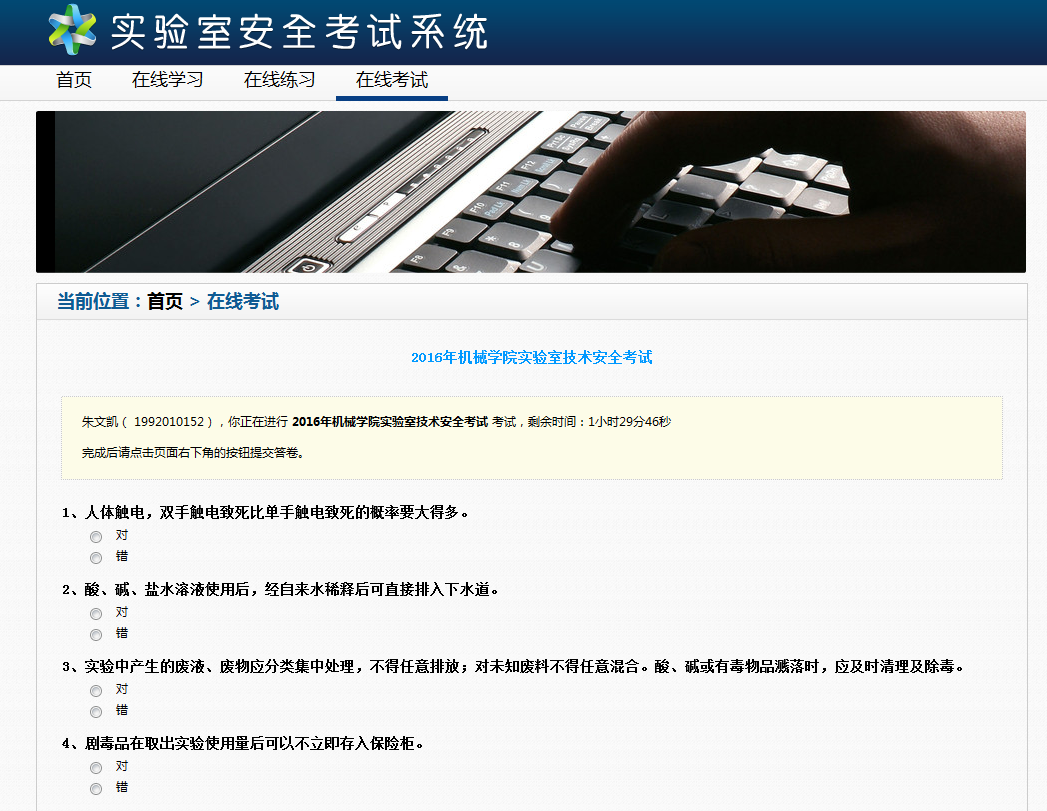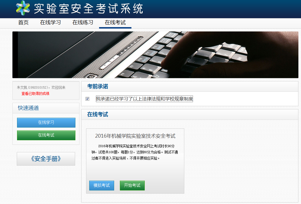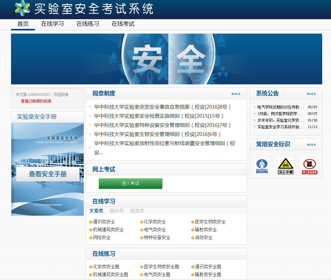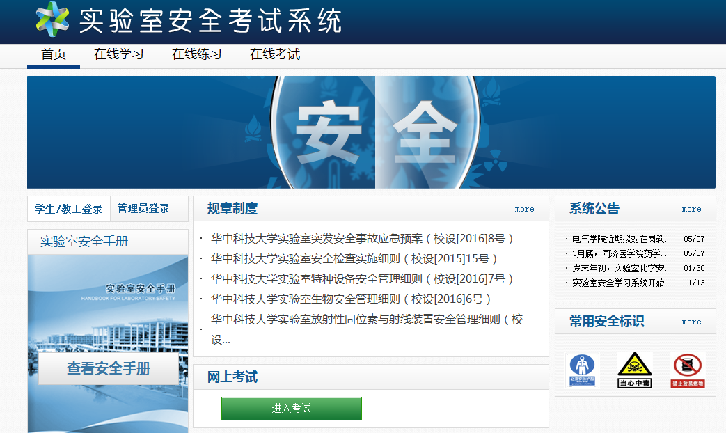 3. 登录后会出现如下界面,可以先在线学习有关实验室技术安全的知识以及在线练习,觉得相关知识已掌握后,点击“进入考试”按钮,进入在线考试界面;
