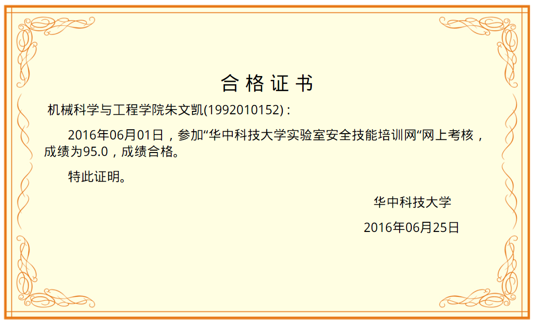 8. 成绩合格的可以集中打印,也可以自行打印合格证书,证书样式如下: