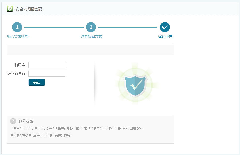 6、在跳转后出现的页面中输入“新密码”及“确认新密码”,然后点击“确认”按钮,完成密码找回过程。