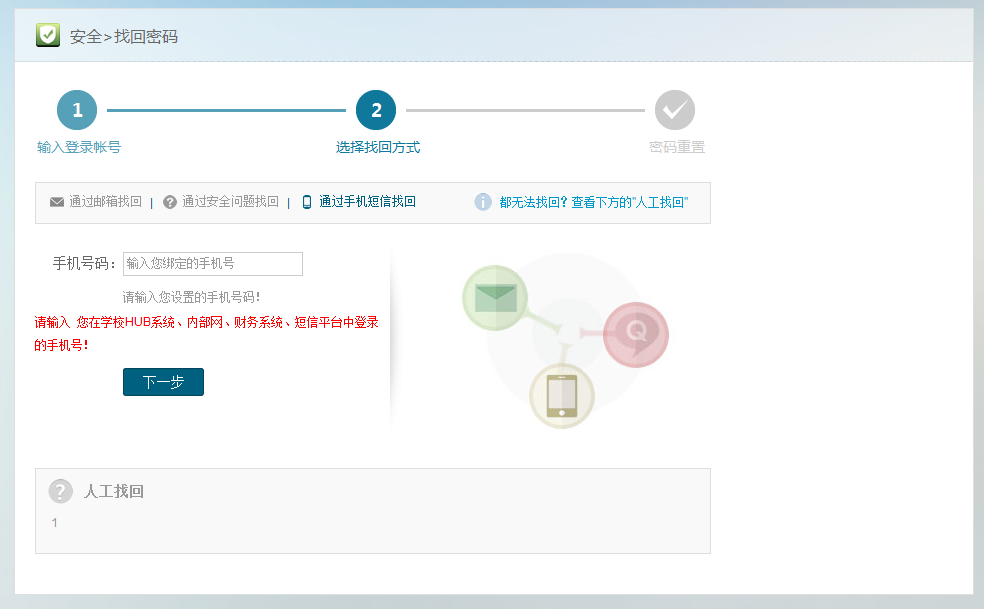 4、以手机短信找回为例,在下图中的“手机号码”输入框中输入您的手机号码,点击“下一步”按钮;