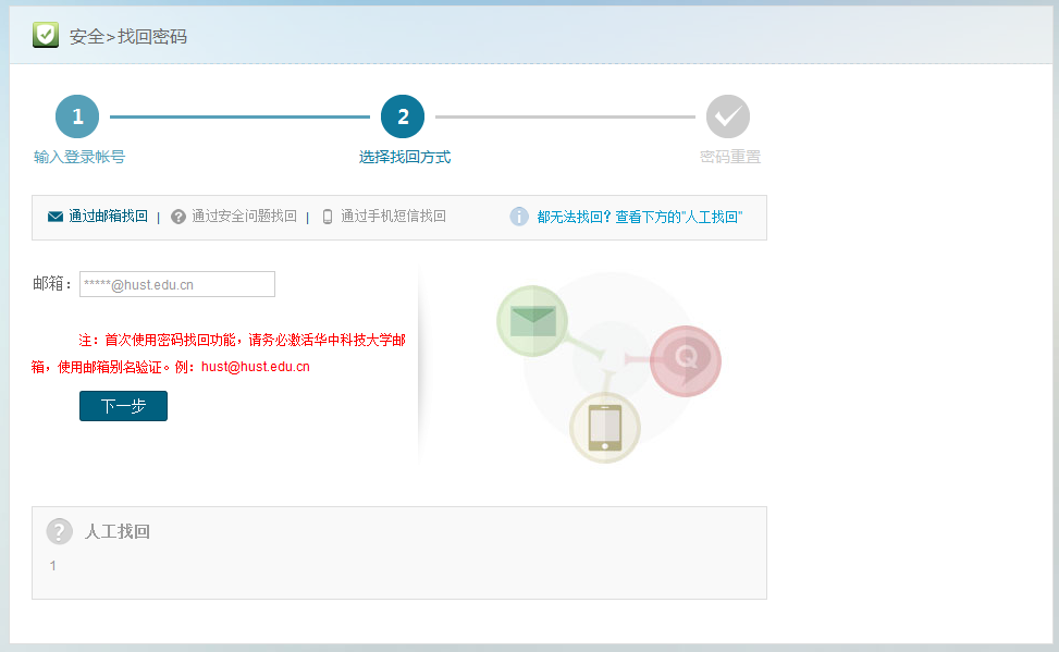 3、可以选择“通过邮箱找回”或“通过手机短信找回”,然后点击“下一步”按钮;