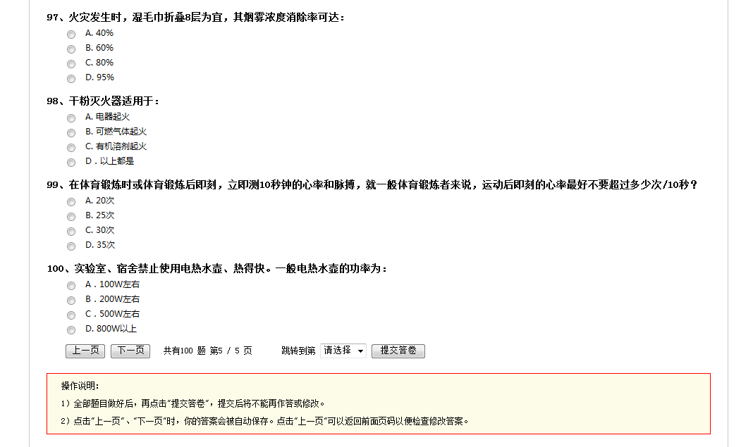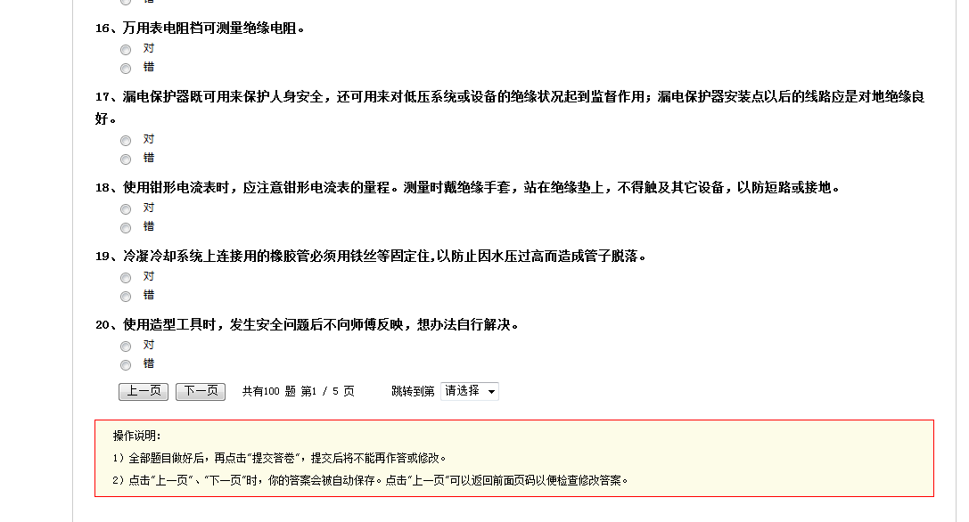 6. 答题页面如下系列图所示,判断题勾选对错,单选题勾选正确选项,按“上一页”和“下一页”进行翻页;