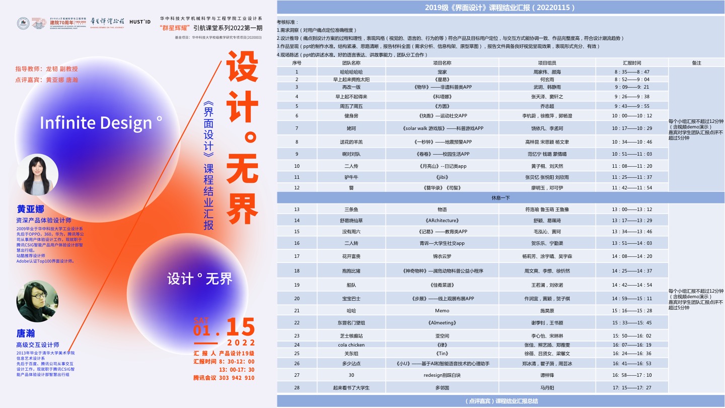 共62位同学组成的28个小组顺利完成汇报。设计内容涵盖天文科普、地震预警、心理疗愈、非遗文化、娱乐社交与公益慈善等,包括前期界面设计的用户调研、市场调研,中期阶段通过信息架构、低保真模型确定内容架构,后期进行视觉分析与规范制定后完成产品的高保真模型与最终展示效果。