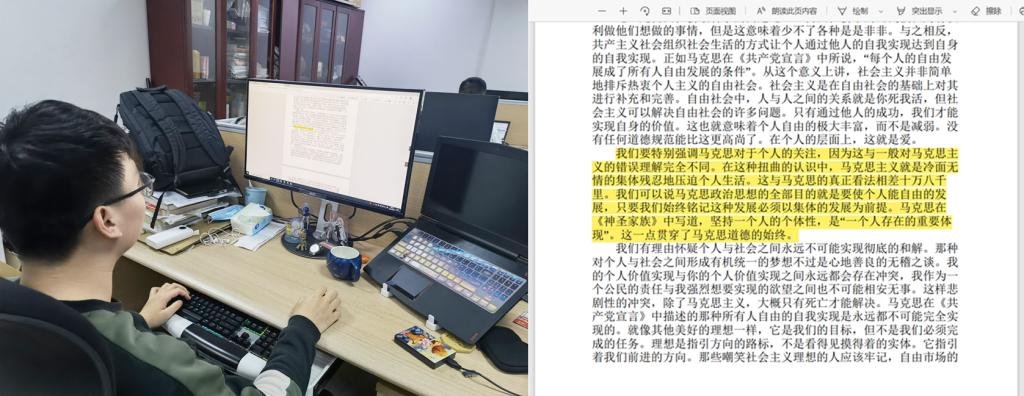 王照宇同志阅读了《马克思为什么是对的》,这本书于2011年出版, 一共有十章,分别提出了西方反对马克思主义的十个观点并一一进行了辩驳。目前他阅读了前四章,感觉该书的写作语言通俗易懂,解答了自己不少疑惑,对理解马克思主义很有帮助。以第三章为例,辩驳的观点是马克思主义是一种宿命论,认为社会主义是历史发展的必然。任何事情都存在一定的必然性,而这种必然性并不等同于宿命论。随着生产力的发展创造出能满足所有人需求的剩余价值之后,社会主义会替代掉资本主义。